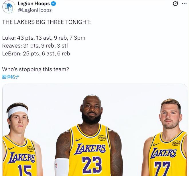 这就是湖人三巨头合体的完美效果,东契奇轰下43分9篮板13助攻,里夫斯得到31分9篮板3助攻3抢断,詹姆斯得到25分6篮板6助攻。三巨头联手贡献99分24篮板22助攻,率领湖人以135比118击败快船,取得五连胜,战绩来到了13胜4负,升回到西部第二,同时从NBA杯西部B组突围,锁定了NBA杯淘汰赛的资格。